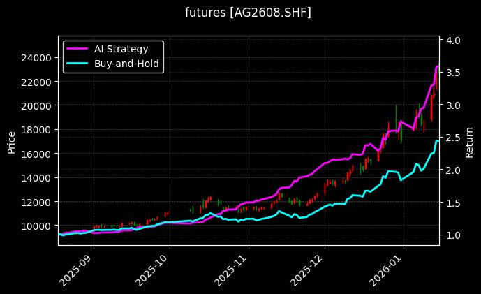 该图表展示了策略净值与基准净值的对比走势。曲线显示,在相同时间内,AI策略的净值增长显著高于基准,体现了其优越的投资效果。